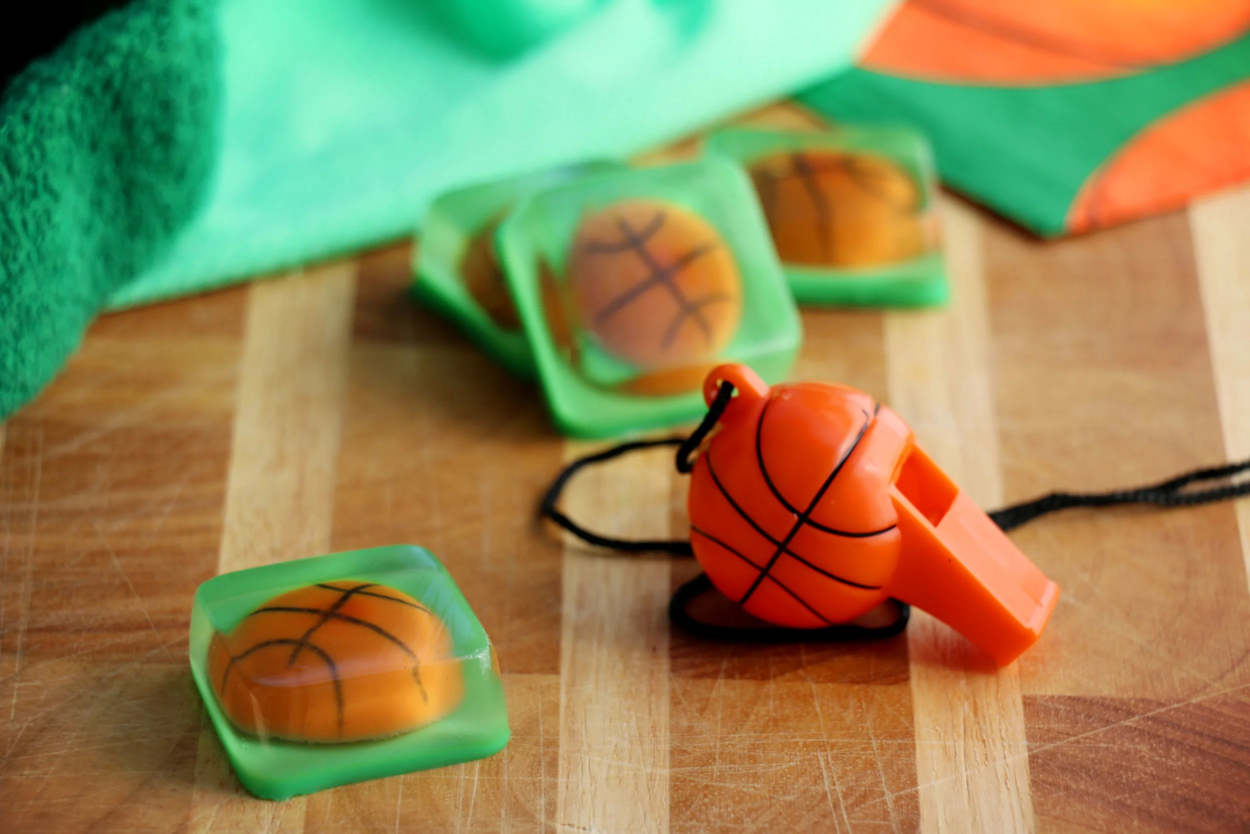 Orange creamsicle gelée with an embedded vanilla bean sweetened condensed milk gelatin basketball